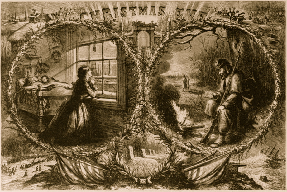 Siamo in piena guerra civile, in quel dicembre 1862 in cui le cose sembravano volgere al peggio per l’esercito dell’Unione. Poco prima di Natale, Nast pubblica sull’Harper’s Weekly un dittico dal forte impatto: alla Vigilia di Natale, due bambini dormono sereni e di tutto ignari, nel caldo del lettuccio. Inginocchiata alla finestra, la mamma prega per la salvezza del marito al fronte; e, come cupo presagio di morte, si intravvedono sullo sfondo le tombe dei caduti.