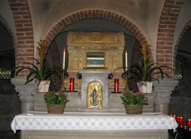 E in effetti, se venite a Pavia e andate a visitare la chiesa di S. Pietro in Ciel d’Oro, non v’imbattete solamente nella grandiosa arca di Sant’Agostino, che custodisce le reliquie del vescovo di Ippona. Se scendete nella cripta, ancor oggi potete pregare presso le reliquie di san Severino Boezio – che, evidentemente, trovata una sistemazione di suo gradimento, ebbe il buon senso di “morire del tutto” e mettersi a riposare nella sua tomba, come tutti i morti di questo mondo.
