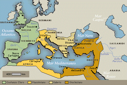 Diocleziano e Massimiano, i due co-Imperatori, si spartiscono l’Impero in due parti uguali. Ognuno dei due sceglie due “vice”, e gli affida un altro pezzo d’Impero: questi vice sono Galerio, per quanto riguarda Diocleziano, e Costanzo Cloro, per quanto riguarda Massimiano.