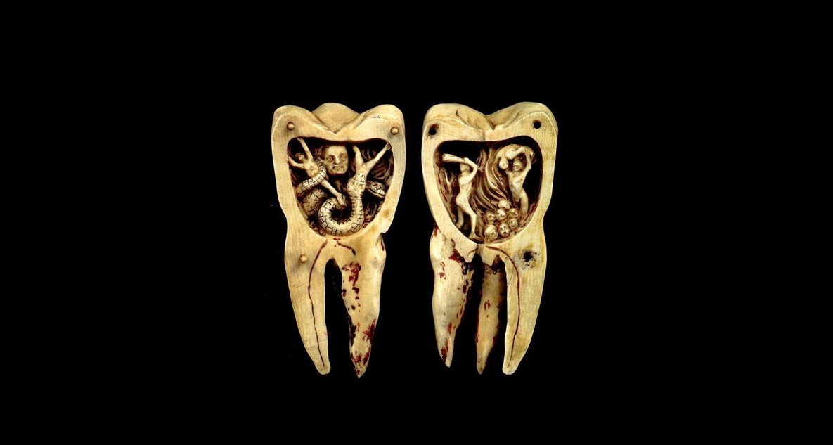 E infatti, potete vederlo raffigurato qui, in tutta la sua bellezza (?), in un manufatto francese di fine XVII secolo. L’anonimo artista che aveva lavorato questa scultura d’avorio rappresenta il verme dentale con una certa cruda eloquenza. In un dente dolorosamente spaccato in due, vediamo un verme che afferra e divora un tristo malcapitato. Nell’altra metà del dente, assistiamo a una vivida rappresentazione del tipo di dolore provocato da un ascesso: l’artista lo paragona alle pene provate dai dannati mentre sprofondano nelle fiamme dell’Inferno. Probabilmente, non del tutto a torto…