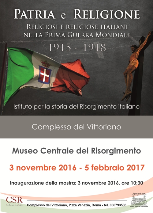 Se siete Romani, o avete intenzione di fare una gita a Roma, oppure vivete da tutt’altra parte ma nutrite un forte interesse per la Storia della Chiesa (e/o della prima guerra mondiale), provate a dare un’occhiata alla mostra “Patria e Religione. Religiosi e religiose italiani nella prima guerra mondiale”, ospitata dal Museo Centrale del Risorgimento di Roma (al Vittoriano, appunto) fino al 5 febbraio 2017.