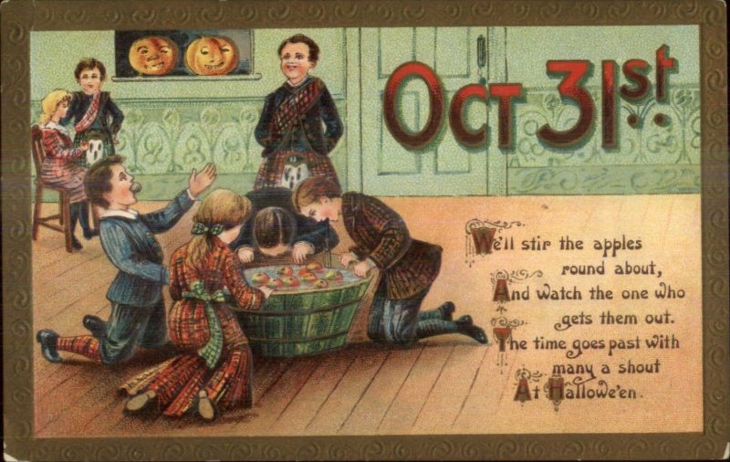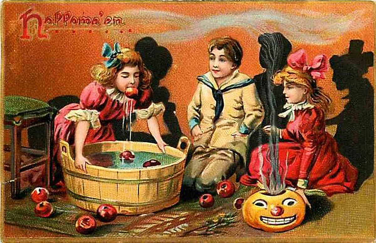 cioè, “pescare” a turno, con l’unico aiuto dei propri denti, le mele che galleggiano in un catino pieno d’acqua. Quantomeno, non un attentato alla proprietà privata; ciò non di meno, non esattamente l’hobby che suggerirei in una festa di quartiere nel mezzo di una pandemia influenzale.