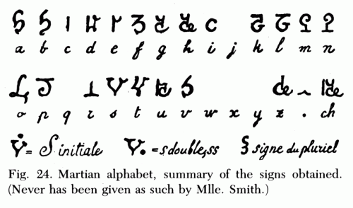 E sul versante scrittura ci sarebbe da aprire una ampia parentesi – perché, non paga di aver descritto Marte all’umanità, Hélène decise anche di dare ai suoi conterranei un assaggio della lingua locale. Immergendosi in lunghe trance, la medium cominciò a produrre una lunga serie di testi in marziano, scritti in un alfabeto dalle forme grafiche inedite e con una struttura grammaticale che, alla prova dei fatti, si teneva, con tanto di coniugazioni verbali, declinazioni dei sostantivi e tutto ciò che occorre a formare una lingua.