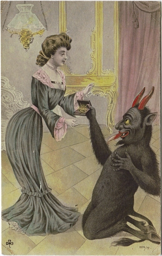 Scontato dire che il Krampus del folklore non s’era mai sognato di far nulla del genere. Per quanto potessero essere irresistibilmente comiche (‘nsomma) delle cartoline di Natale in cui un mostro faceva gli occhi dolci alle signore, si trattava di rappresentazioni completamente out of character, come si suol dire.