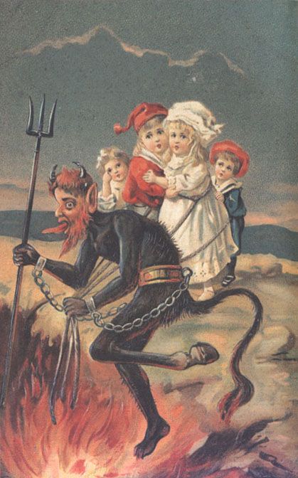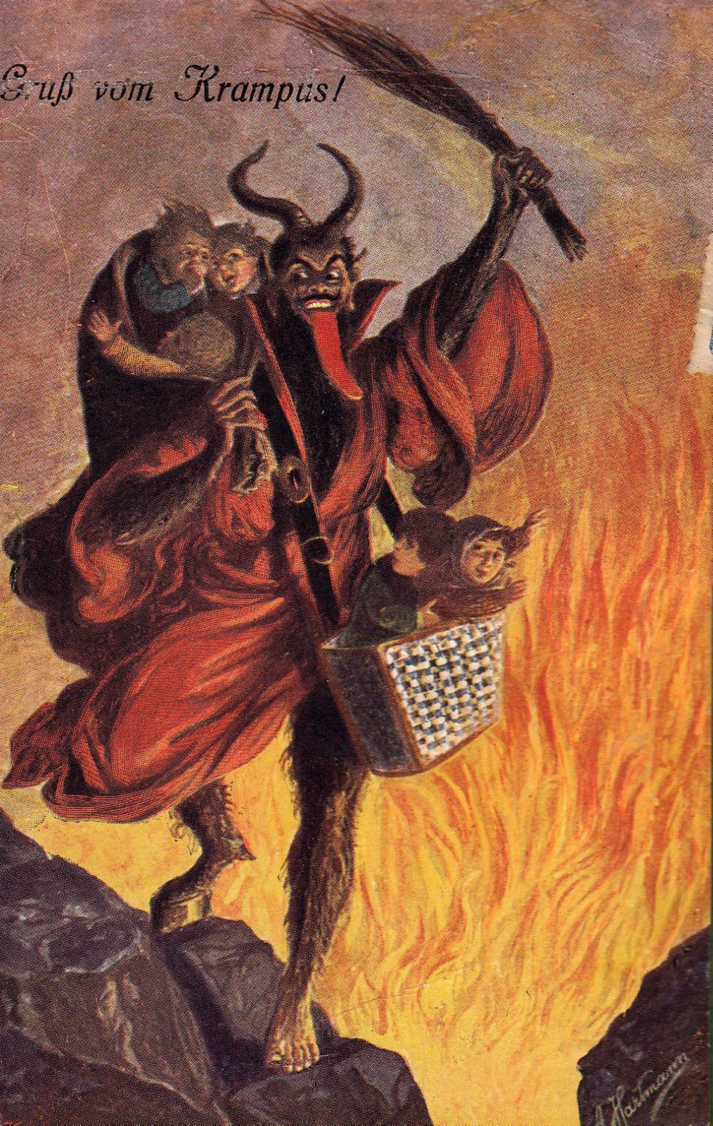 Nonostante molte cartoline lo raffigurino come un diavolo maligno, talvolta addirittura colto nell’atto di trascinare nella bocca dell’Inferno (!) i pargoletti che non sono stati bimbi buoni, il Krampus non rappresentava, originariamente, il diavolo.