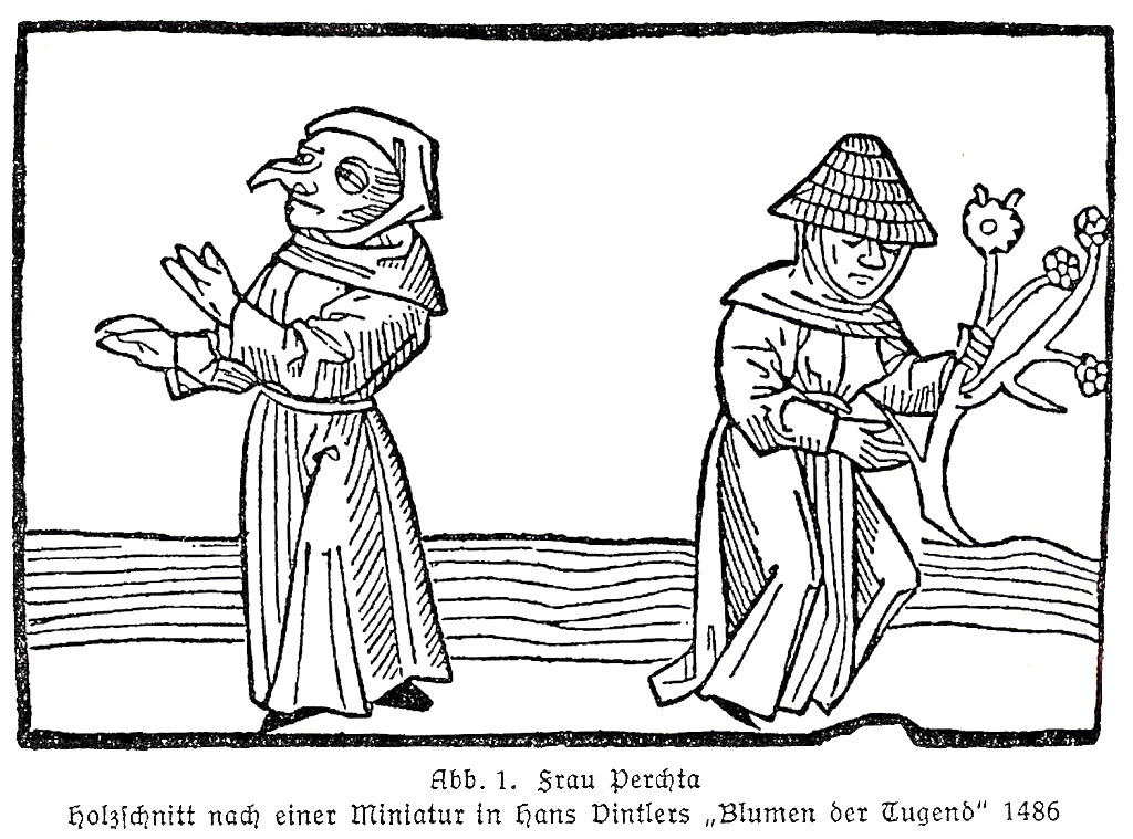 Per quanto riguarda la maschera portata dal medico della peste, se ben ricordo nasce solo da una questione pratica: il becco era un contenitore per erbe medicamentose che dovevano servire per “purificare” l’aria dai miasmi pestilenziali. Non credo ci siano paralleli con Perchta.