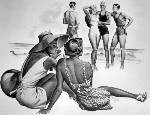Vacanzieri mezzi nudi e nudi per tre quarti sotto lo sguardo giudicante delle signore, in una stampa del 1937
