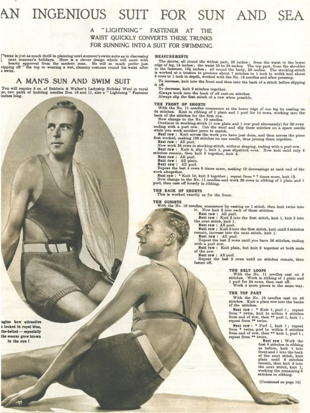 E a proprio al fine di aumentare quanto più possibile i centimetri di pelle scoperta (“il sole fa bene, è per la salute!”) i costumi da bagno cominciano a subire un graduale ma percettibile restringimento. I pantaloncini maschili e femminili si accorciarono visibilmente di stagione in stagione. La scollatura si abbassò un tantinello; le schiene, invece, si scoprirono del tutto. Tagli, spacchi e feritoie cominciarono a decorare i costumi maschili e femminili; ma se l’abbigliamento per signore non osò mai restringersi oltre i limiti della decenza, non lo stesso si poté dire riguardo alle tenute dei galantuomini.
