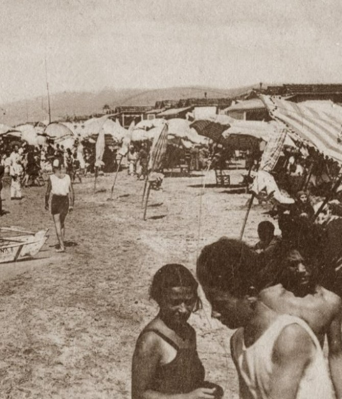 Qualche coraggioso bagnante a torso nudo comincia a fare capolino nella Viareggio degli anni ’20