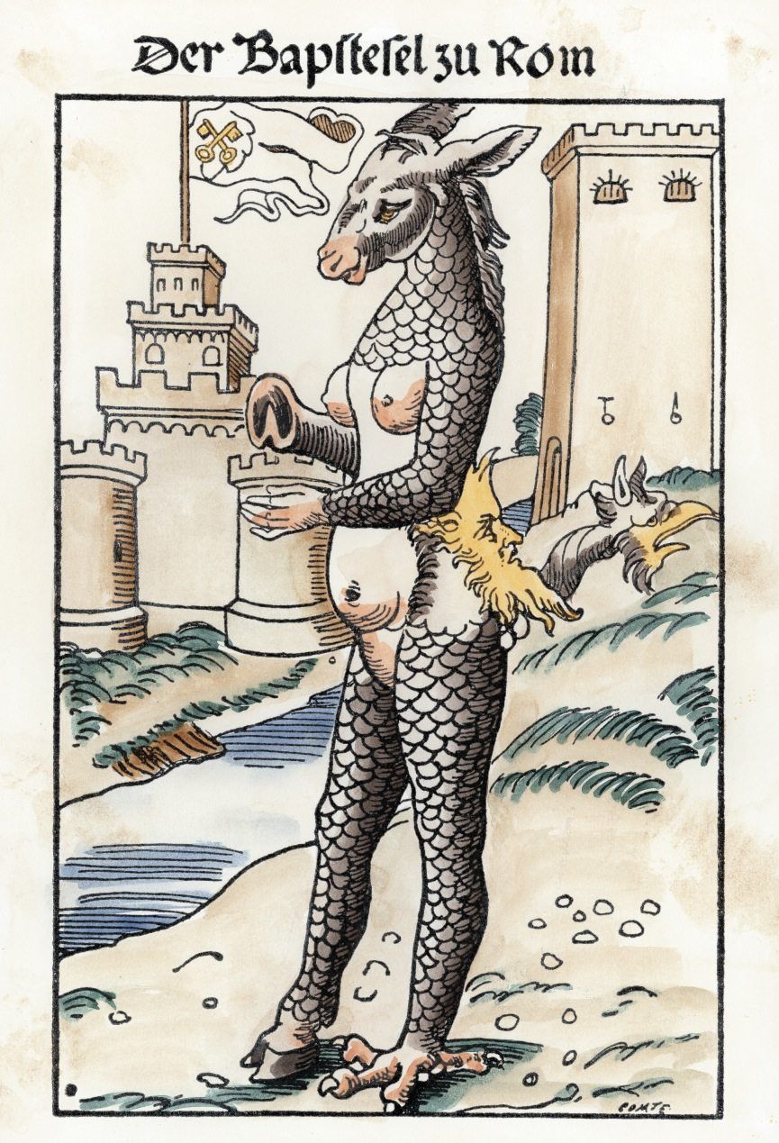 Tornando in Germania dopo il suo soggiorno italiano, Luca di Praga si mise in contatto con Werner von Olmutz, incisore di professione, e gli commissionò la creazione di un disegno che desse conto di quella mostruosa apparizione. L’immagine, data alle stampe con altissima tiratura, era accompagnata dal titolo eloquente di Papst-esel, ovverosia “papa asino”: l’essere mostruoso rinvenuto sul greto del Tevere, insomma, veniva presentato come un segno del modo in cui Dio vedeva veramente l’uomo che indegnamente sedeva sul soglio di Pietro: un asino ignorante, rapace, sessualizzato, con un secondo volto serpentino (e dunque una seconda mente, infida come quella di una vipera) che spuntava nelle pudenda, lasciandosi governare dai bassi istinti.