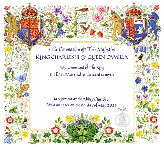 – La cornice è composta da fiori di campo che sono stati scelti in base al loro significato nel linguaggio dei fiori e/o a preferenze di vari membri della Royal Family. In particolare, troviamo: mughetto (risaputamente il fiore preferito della regina Elisabetta), fragoline di bosco (a quanto pare molto amate da molti membri della famiglia), rose canine (simbolo di amore anche nel lutto nel linguaggio dei fiori), rosmarino (culturalmente simbolo di memoria dei defunti, nel Regno Unito) fiordalisi (simbolo di speranza nel linguaggio dei fiori), campanule (simbolo di umiltà e costanza nel linguaggio dei fiori). Molti dei fiori crescono a gruppi di tre o comunque si ripetono tre volte in punti diversi dell’invito, dichiaratamente per simboleggiare che Carlo è il terzo re della Storia britannica a regnare con quel nome.