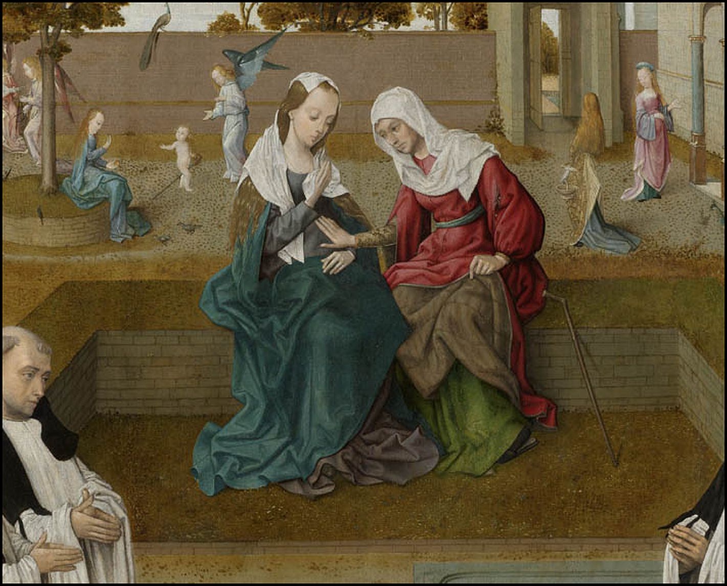 Negli ultimi secoli del Medioevo, e soprattutto nell’arte figurativa del Nord Europa, le rappresentazioni di questo episodio cominciarono a sfruttare artifici grafici che, agli occhi di noi contemporanei, sembrano davvero anticipare il concetto di ecografia. Spesso le gravidanze di Elisabetta e Maria venivano mostrate attraverso un effetto “a raggi X”: il ventre delle donne diventava trasparente per permettere all’osservatore di contemplare la presenza dei bambini. Oppure (lettura alternativa, forse anche più probabile): i nascituri erano circonfusi d’una aureola così luminosa da attraversare il corpo e le vesti delle madri per mostrarsi al mondo in tutta la sua potenza.