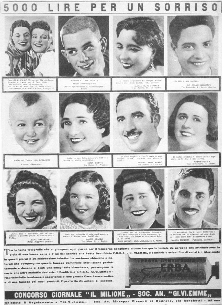 Nel 1939, una legge di Pubblica Sicurezza vietava le sfilate in passerella e scoraggiava l’ostentazione del corpo femminile a scopi puramente estetici. Ma Dino Villani – il pubblicitario che la ditta farmaceutica aveva recentemente assunto per cercare di svecchiarsi – trovò brillantemente un modo per aggirare l’ostacolo: se non si potevano far sfilare donne in carne e ossa, e se lo sguardo dei giudici non avrebbe potuto soffermarsi sulle linee dei loro corpi, di certo non sarebbe stato né scandaloso né riprovevole concentrare le proprie attenzioni sulla ricerca del più bel sorriso d’Italia. Soprattutto se questa ricerca era finalizzata alla buona causa di aiutare una storica azienda emblema dell’orgoglio italico, e attualmente bisognosa di aumentare il suo fatturato!