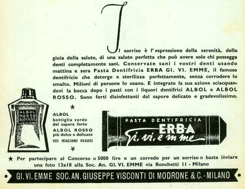 Già a partire da quel glorioso 1939, le sue vendite avevano fatto il boom, godendo di una popolarità che faceva specchio a quella del concorso di bellezza. E la ditta Erba fu talmente compiaciuta dai risultati che, per diversi anni, divenne lo sponsor principale della rassegna nascente di Miss Italia – che ancor oggi mette in palio un piccolo montepremi anche per lei che sarà eletta Miss Sorriso, in un omaggio a quella storia ormai antica che molti considerano, de facto, l’embrione da cui nacque il concorso di bellezza più ambito dalle Italiane.