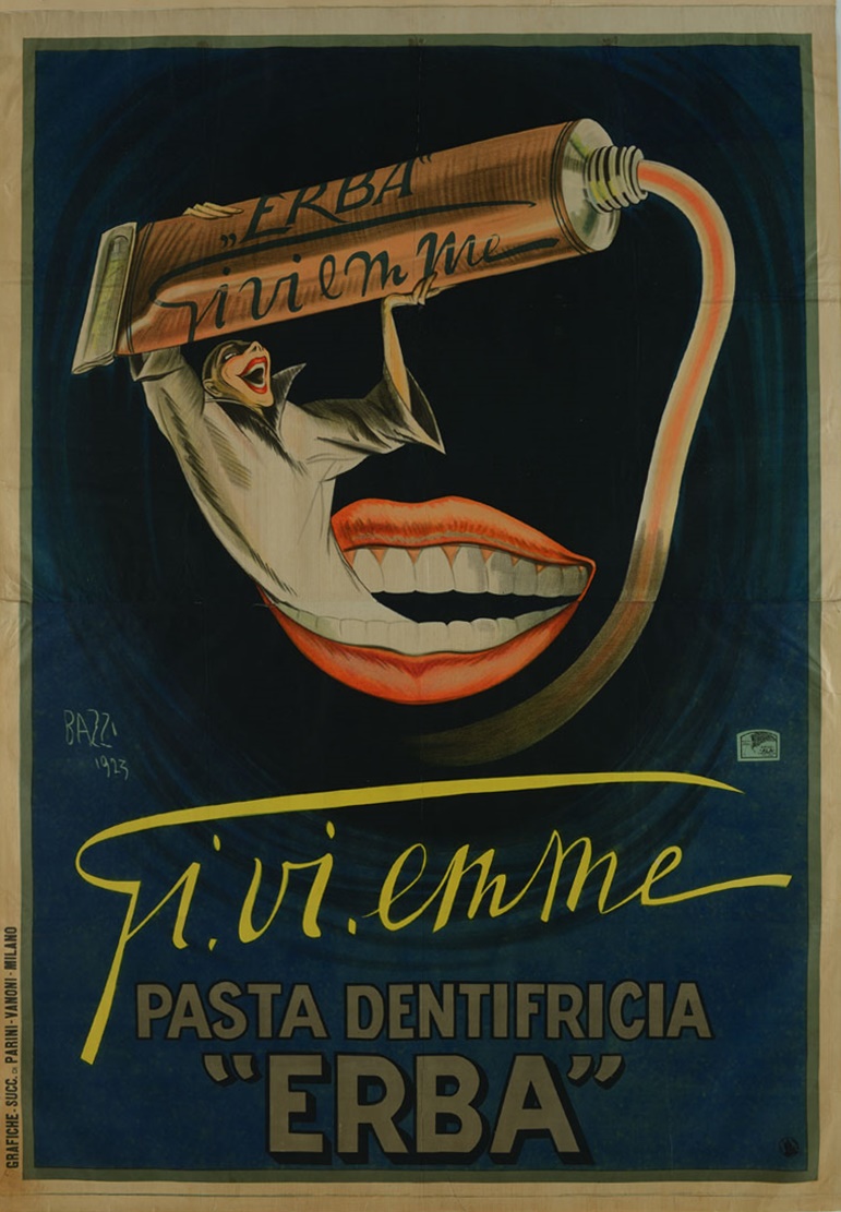 Il dentifricio Erba-Giviemme aveva un problema, anzi due: il primo era un reparto marketing che evidentemente dava impiego a dei disturbati, visto che i grafici producevano locandine tipo questa, in un’epoca in cui non è che fosse molto normale pubblicizzare prodotti per l’igiene orale ricorrendo all’immaginario di spettri col trucco da drag che fuoriescono dalle labbra schiuse delle clienti.