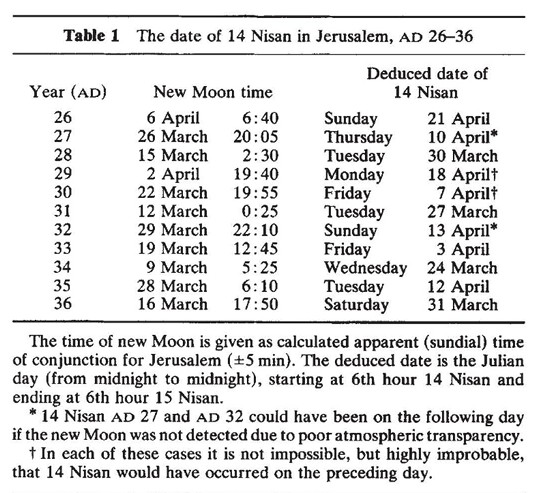 Tenendo conto dell’altezza della luna, della luminosità del cielo al tramonto e di altri fattori di contorno, gli autori hanno stilato una tabella che dà conto di quelle che, a loro giudizio, dovrebbero esser state le date d’inizio del mese di Nisan, a Gerusalemme, negli anni che vanno dal 26 al 36. La data della Pasqua, che cade sempre nel quattordicesimo giorno del mese di Nisan, viene calcolata di conseguenza.
