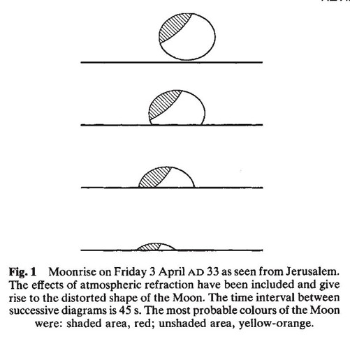 Ridotta all’osso, la loro tesi è “sappiamo che c’è stata un’eclisse di luna il 3 aprile del 33, ed esistono alcuni testi cristiani che sembrano conservarne il ricordo; se ipotizziamo che Gesù sia morto proprio quel giorno, ne deriva che la profezia biblica cui volle rifarsi san Pietro nel giorno di pentecoste dovesse suonare tutto d’un tratto molto concreta alle orecchie degli ascoltatori. Dunque, la data del 3 aprile 33 risulta essere il miglior candidato”.